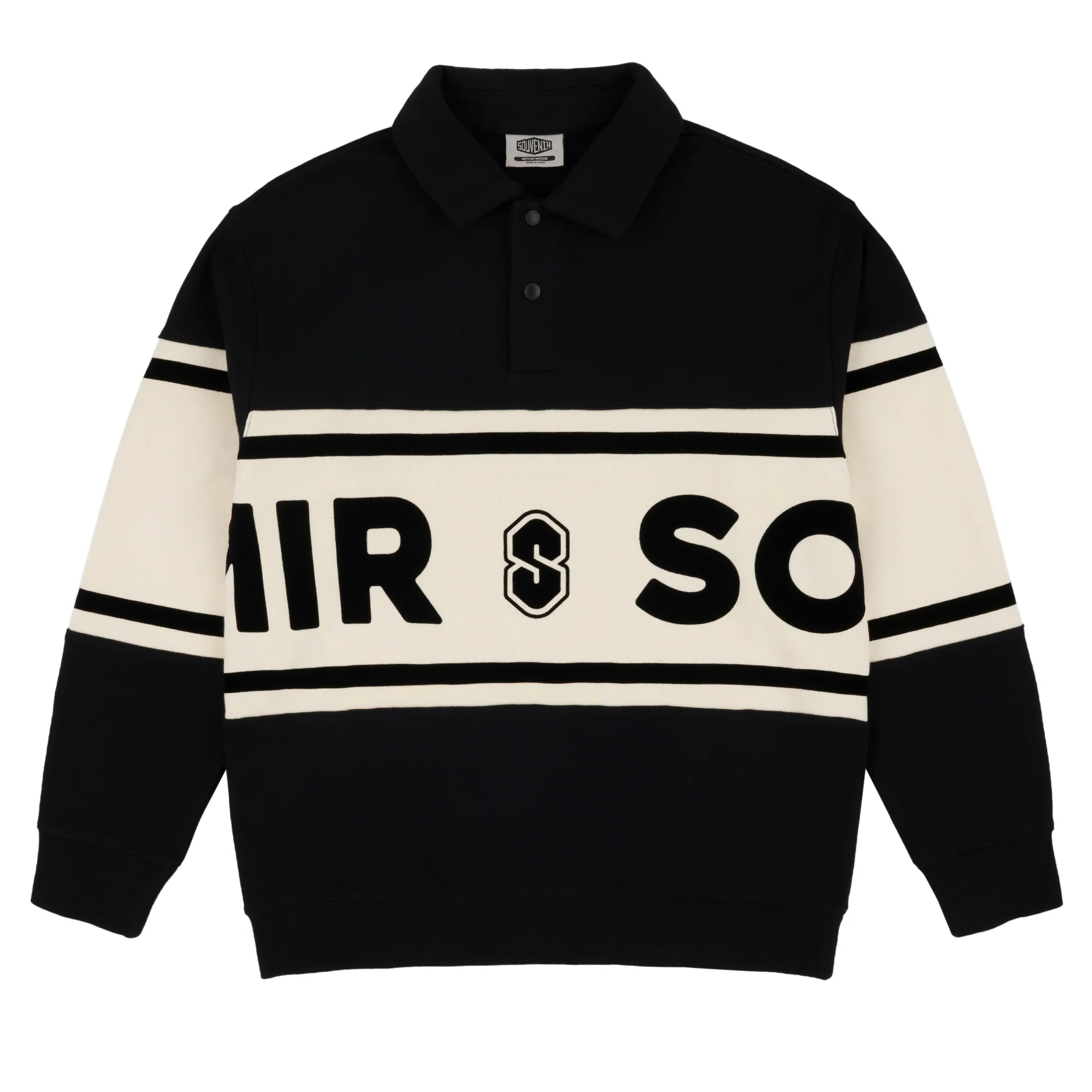The Souvenir Rugby Style Shirt reimagines a classic with heavyweight 380gsm reverse weave fleece for a warm, durable feel. A self collar with rubberized snaps, rib cuffs and waist, plus cut-and-sew striping with flocking detail give it an authentic yet elevated look. Finished with a bold wrap-around flocked logo, this piece blends vintage rugby styling with modern streetwear edge.